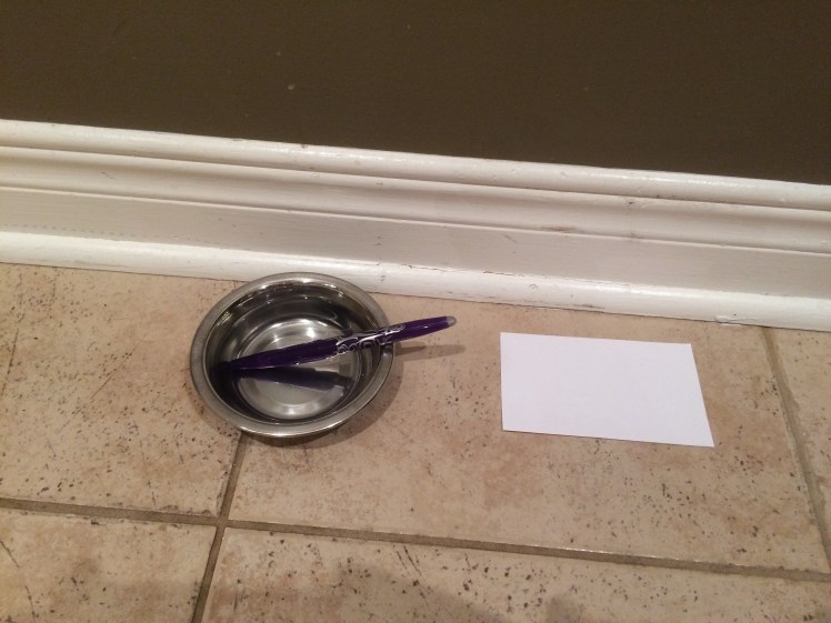 Cette nuit, ils ont laissé traîner des indices de leurs super pouvoirs. J’ai trouvé un crayon dans leur gamelle d’eau et juste à côté, un papier blanc. Ils ont sans doute été distraits dans leur inspiration.