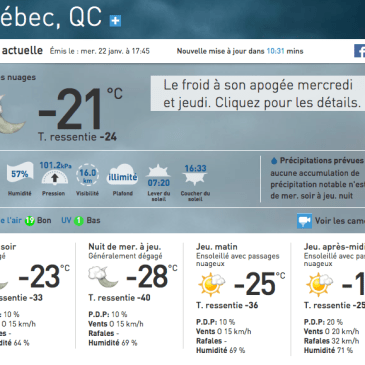 Ce matin, je suis sortie quelques minutes sur la galerie et je suis rentrée toute grelottante. En regardant le thermomètre j’ai dit à ma fille de 15 ans : —Il fait -3°C. C’est froid aujourd’hui. Sans lever la tête de ses devoirs, elle a répondu : —Avec un petit zéro de plus, il va faire frette. (Frette … Lire la suite La récréation 32 (Froid ou Frette?)